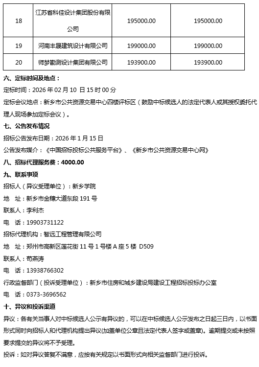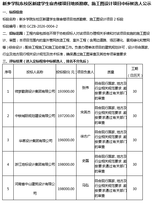 新乡学院东校区新建学生宿舍楼项目地质勘察、施工图设计项目中标候选人公示