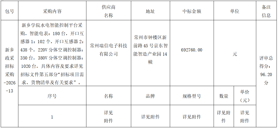 1.采购内容:新乡学院水电智能控制平台采购,智能电表:180台,开口互感器1:102个,开口互感器2:438个,220V分体空调控制器:350台,380V分体空调控制器:1020台,具体内容及要求详见招标文件第五部分“招标项目需求、货物清单及有关要求”。